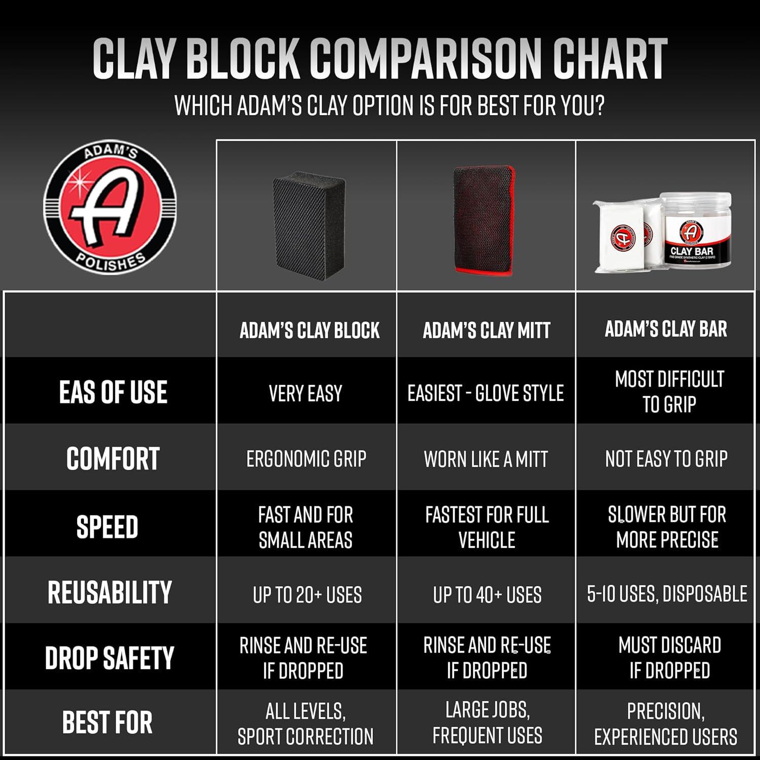 Adam’s Polishes Clay Block (2pk) was designed as a hybrid between a traditional clay bar and our Clay Mitt. The Clay Block removes embedded particles like brake dust, paint overspray, and industrial fallout from your vehicle's surface.