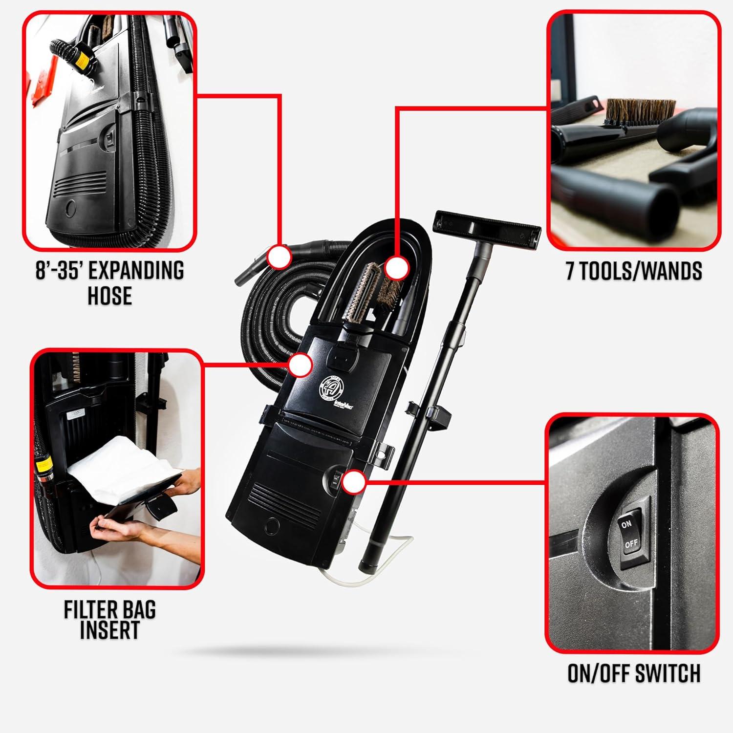 The Adam's InterVac Wall Mounted Vacuum is one of the most compact and lightweight, garage vacuums on the market. With everything available all in one spot, you can grab whichever attachment you need right on the vacuum. At only 9lbs in weight, 2.5' tall, and 4″ in depth this vacuum only takes a few minutes to install. This vacuum features an 8' stretch hose that extends to 35' so you can easily get to either side of the vehicle.